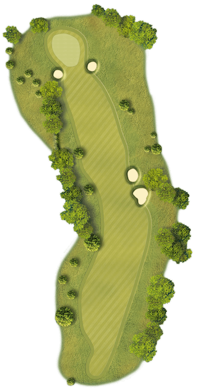 Has a big sloping fairway from right to left towards the ditch, which runs the length of the hole, so the tee shot needs placing to the right whilst avoiding the two fairway bunkers. For the longer hitter a tee shot aimed over the trees is risky but can leave a short wedge into the green. Green slopes from back right to front left making putts up the hill slow but very fast back down the slope.