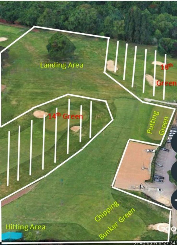 On stroke play competition days a competitor must not practice on the competition course before or between rounds. The defined practice area which can be used on such occasions includes the putting green, chipping/bunker green along with the area to the right of the 14th hole and behind the 1st tee. The practice ground also includes the area beyond the 14th green which lies between the 17th green and 18th green. If a golf ball is mis-hit and ends up in the shaded areas on the diagram, this is not a breach of the rules and will not incur a penalty for the player.